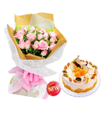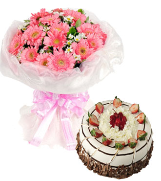 • 【19枝粉色扶郎,白色小菊間插,梔子葉間插】+【8寸鮮奶水果蛋糕】
